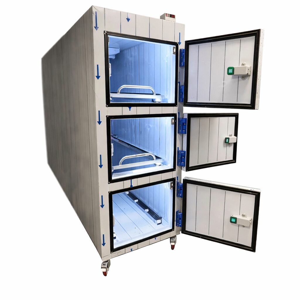TOMU 6030 este o camera mortuara modulara, proiectata pentru pastrarea temporara a corpurilor in conditii controlate, in spitale, institutii medico-legale si servicii funerare. Constructia din otel inoxidabil 304 asigura durabilitate, rezistenta la coroziune si posibilitatea unei igienizari riguroase, conform cerintelor specifice acestui domeniu.
