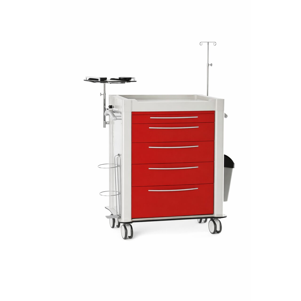 TCEC 1420 este un carucior de urgenta (crash cart) modern, proiectat pentru interventii rapide in medii medicale critice. Structura usoara din aluminiu, combinata cu un blat din ABS antibacterian, asigura durabilitate si igiena ridicata. Caruciorul este echipat cu 5 sertare cu sistem de inchidere centralizata pentru organizarea eficienta a medicamentelor si consumabilelor. Include suport perfuzie reglabil pe inaltime, masa rotativa pentru defibrilator si placa CPR pentru resuscitare. Suportul pentru butelie de oxigen si cosul de deseuri completeaza dotarile necesare in situatii de urgenta.