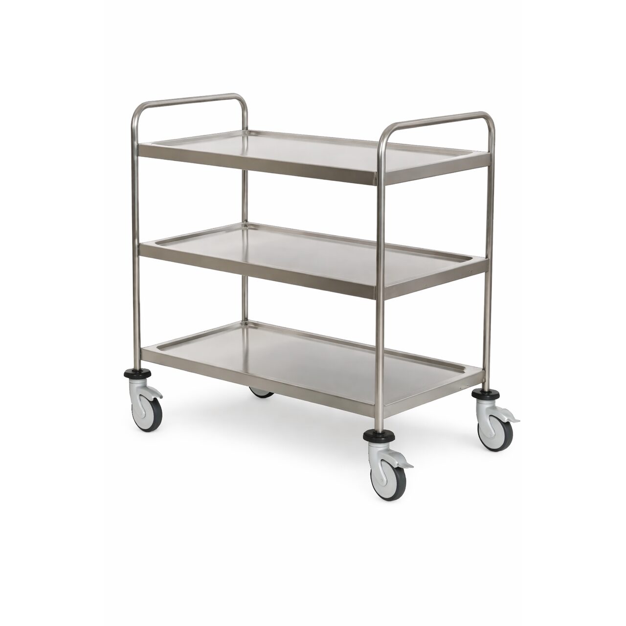 TTAC 3360 este un carucior pentru transport instrumentar cu trei polite, realizat din otel inoxidabil 304 si conceput pentru utilizare in zone sterile. Structura mobila, prevazuta cu maner de impingere si roti cu frane, permite deplasarea controlata si organizarea eficienta a instrumentelor si materialelor pe niveluri separate.