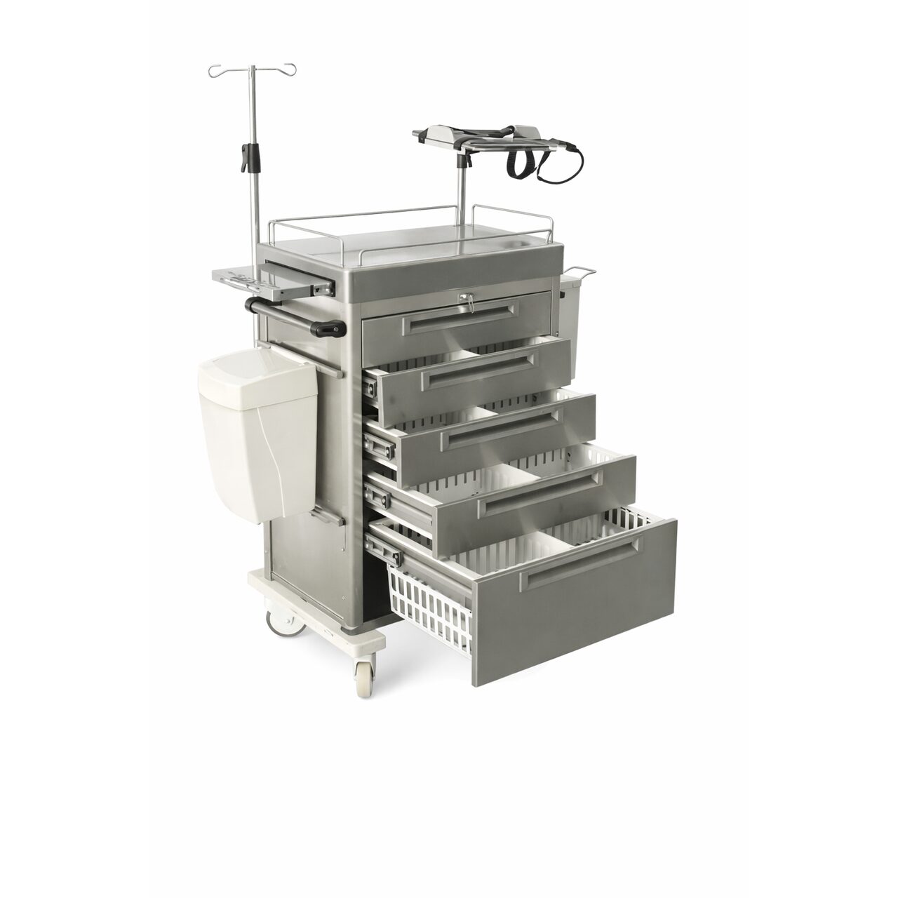 TCEC 1401 este un carucior de urgenta realizat din otel inoxidabil, destinat utilizarii in medii sterile si situatii critice. Constructia robusta si usor de igienizat il recomanda pentru spitale, sectii ATI si bloc operator. Este echipat cu 5 sertare cu sistem de inchidere centralizata, permitand organizarea eficienta a medicamentelor si consumabilelor. Blatul superior este prevazut cu margini de protectie din inox pentru siguranta in utilizare. Caruciorul include masa telescopica pentru prepararea medicatiei, suport perfuzie reglabil si masa rotativa pentru defibrilator. De asemenea, dispune de placa CPR, suport pentru butelie de oxigen si cos de deseuri.