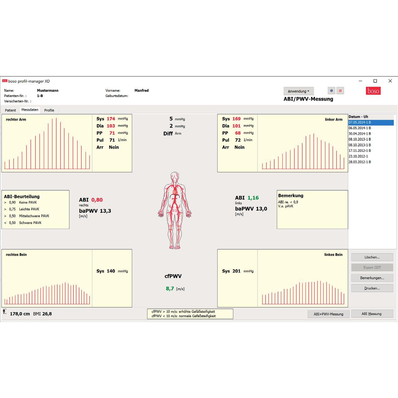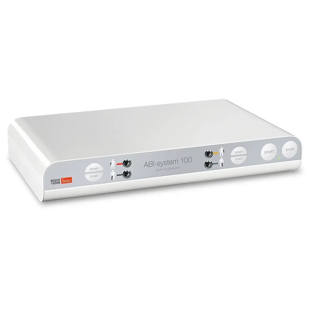 Boso ABI-system 100 este un aparat profesional pentru masurarea indicelui glezna-brat (ABI – Ankle-Brachial Index), utilizat pentru detectarea precoce a bolii arteriale periferice (BAP / PAOD). Dispozitivul masoara simultan tensiunea sistolica la cele patru extremitati si calculeaza automat raportul ABI.
