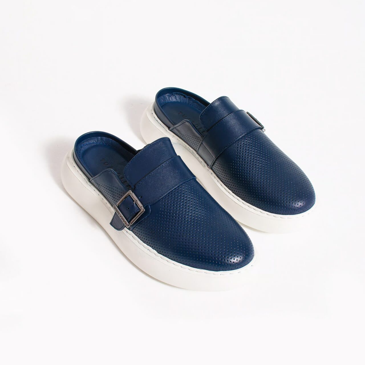 Saboti albastri barbatesti, din piele naturala, cu catarama reglabila
