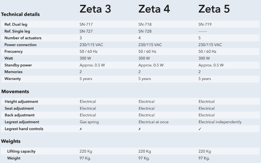 - Ajustare rapida -manerele pe partea laterala a fiecarui suport pentru picioare permit o operare lina, cu o singura mana. (miscare electrica pentru Zeta cu 5 motoare).
