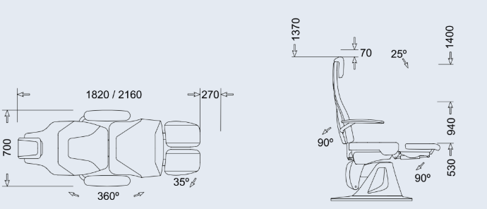 - Suporturi articulate pentru picioare cu latime unghiulara de 30°, montate pe tobogane telescopice cu cursa de pana la 300 mm, inclinabile vertical, capabile sa adopte un unghi de 90° (perfect vertical fata de sol in pozitie de repaus).