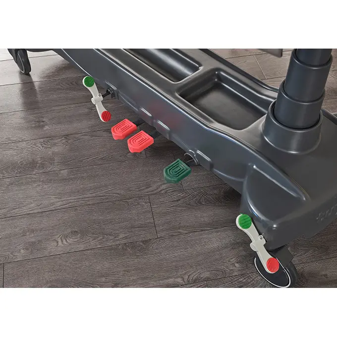 - Roti pivotante Ø150 mm, cu sistem de blocare centrala si directie asistata